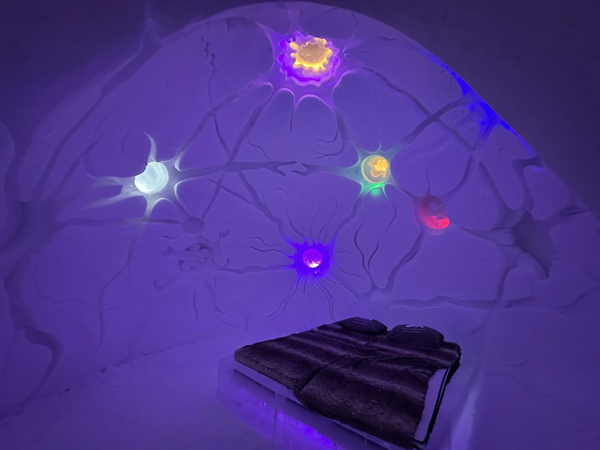 You’ll receive a highly insulated sleeping bag to use on top of the faux fur blanket and mattress embedded into the bed frame made of ice in your room.